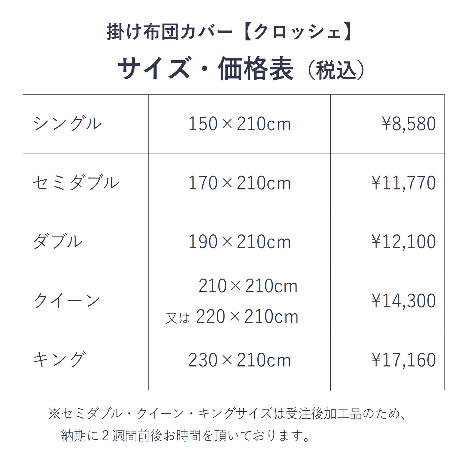 ※セミダブル・クイーン・キングサイズはご注文をいただいてから加工を行うため、お届けまでに2週間前後お時間を頂戴しております。