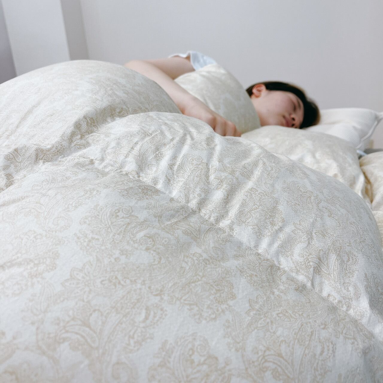 側生地は、天然繊維・綿100%の80番手サテンを使用。しなやかな質感と、通気性・吸湿性を兼ね備え、蒸れにくく心地よい眠りを支えます。カバーをかけてもごわつかず、軽やかな使い心地で、落ち着いた色合いと柄ゆきが上品な印象です。
