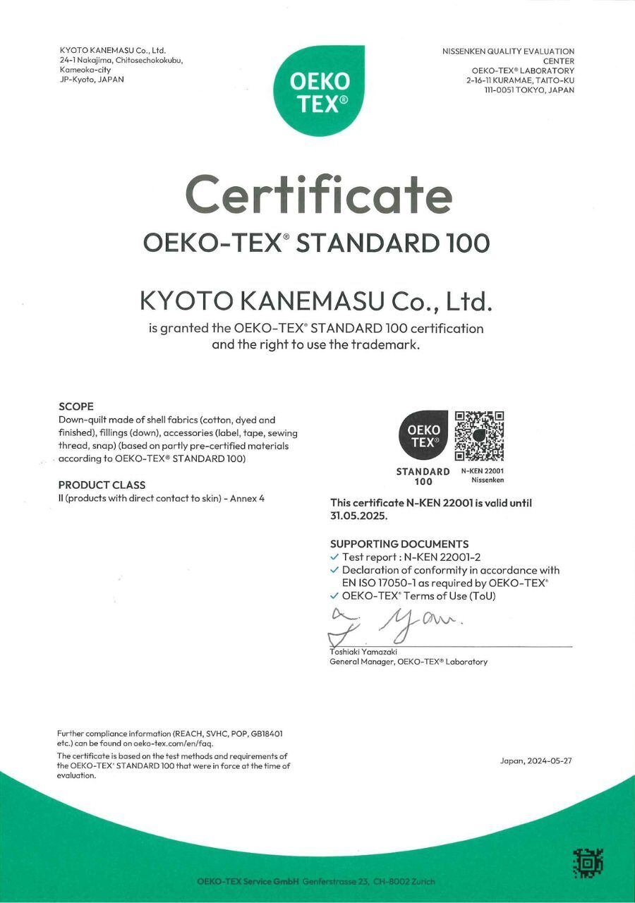 世界最高水準の安全レベルをもって、繊維関連の「素材」や「製品」に有害な化学物質が含まれていないことが証明されています。分析試験の対象となる有害化学物質は1,000種類以上に及び、日本の安全基準をはるかに超える国際的な安全基準です。認証を得るために調査される資材は、羽毛生地・中生地・縫い糸・マチテープ・羽毛原料・ボタンホック・品質表示・ネームの製造において関わるものすべてに亘り、厳しい基準値をクリアしています。